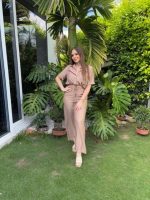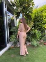 Set de pantalón y crop top color cocoa. Tela: rayon y poliéster.