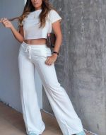 Set de pantalón y camiseta corta. Disponible en color blanco marfil y azul bebe en tela burda algodón amplio.