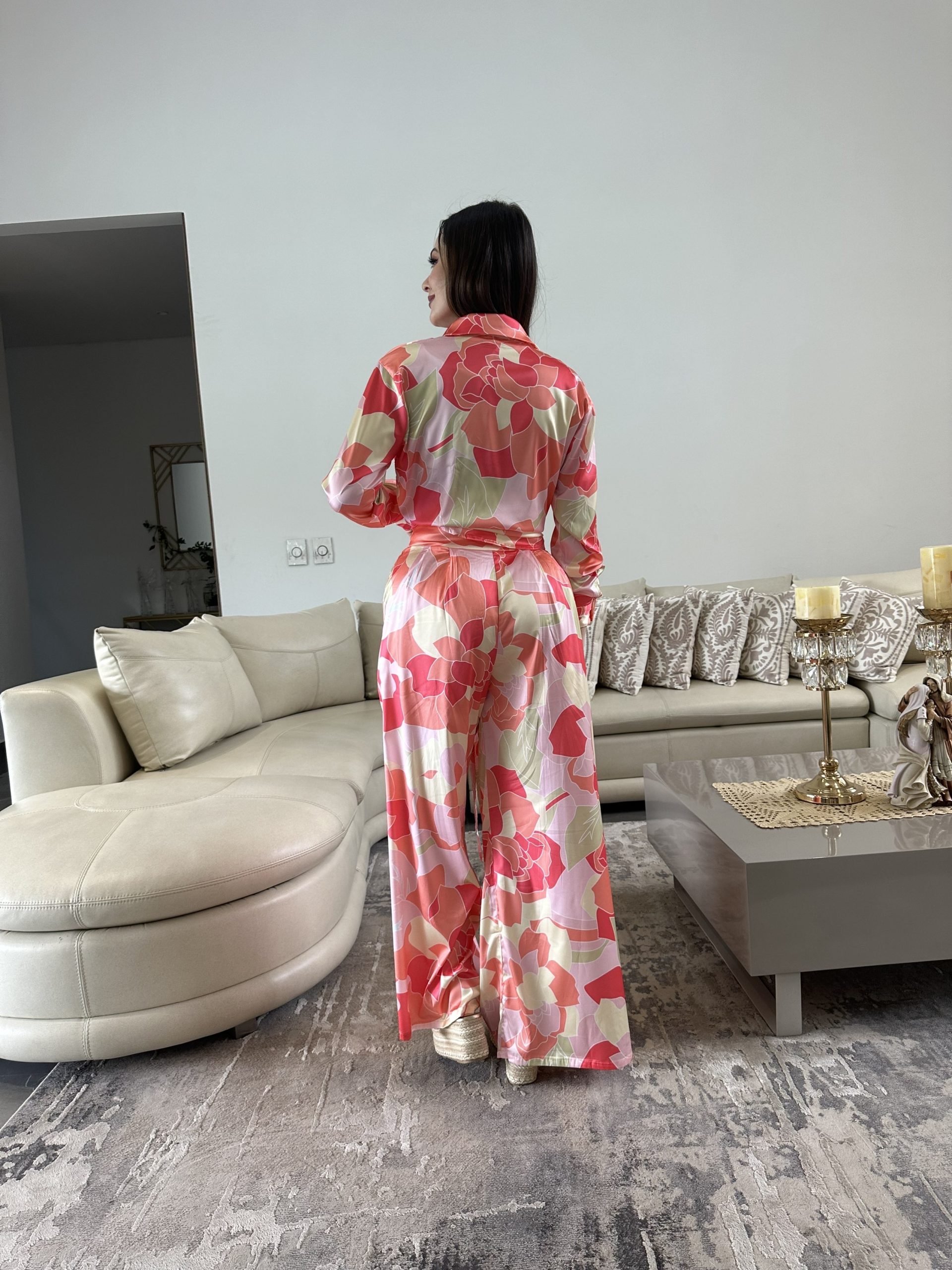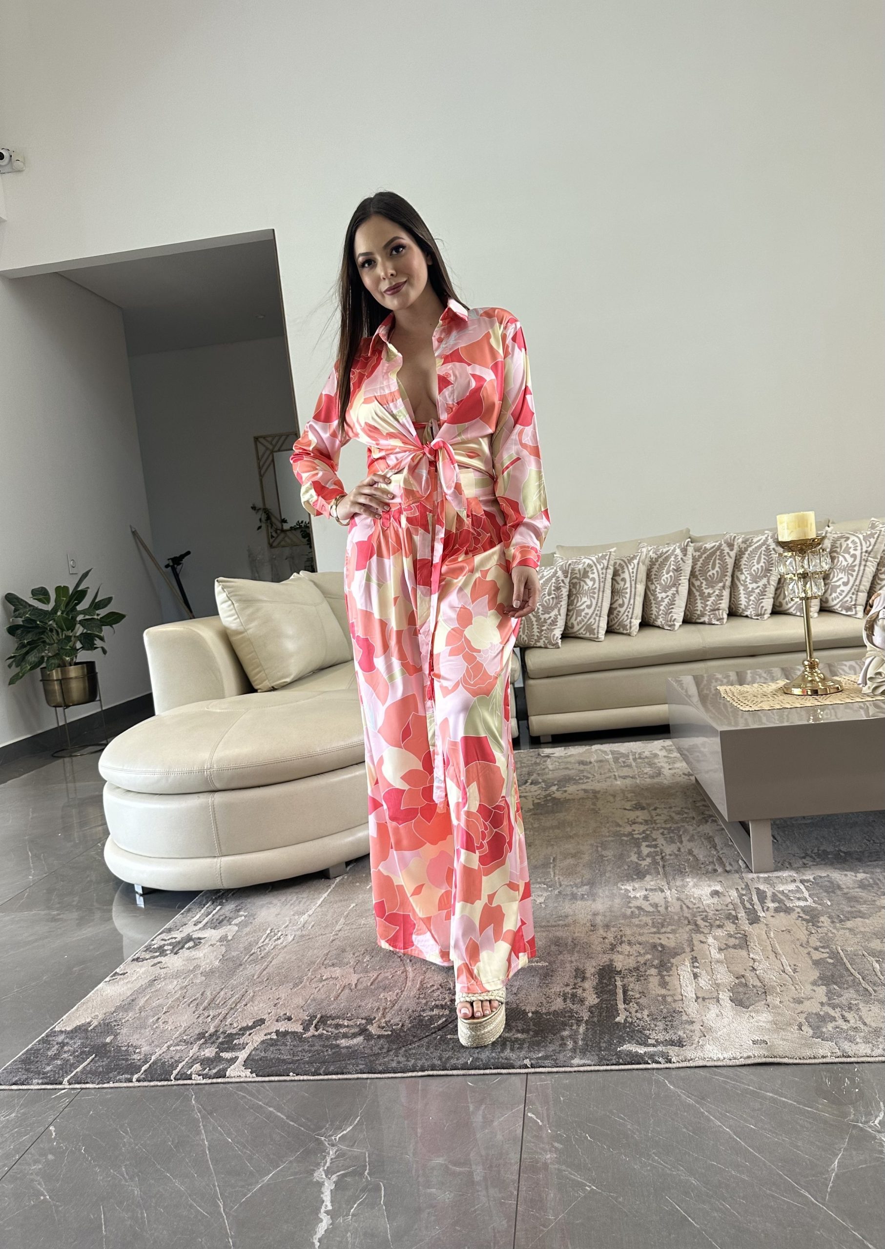 Set americano de 3 piezas (top, camisa y pantalón) estampado en seda.