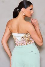 Blusa strapless tipo pañoleta estampada americana en seda.