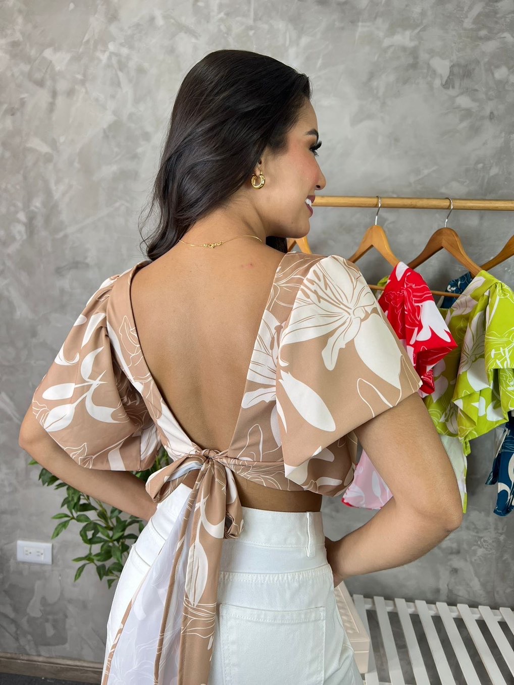 Crop top estampado floral, color beige con blanco. Tela blessed sublimada.