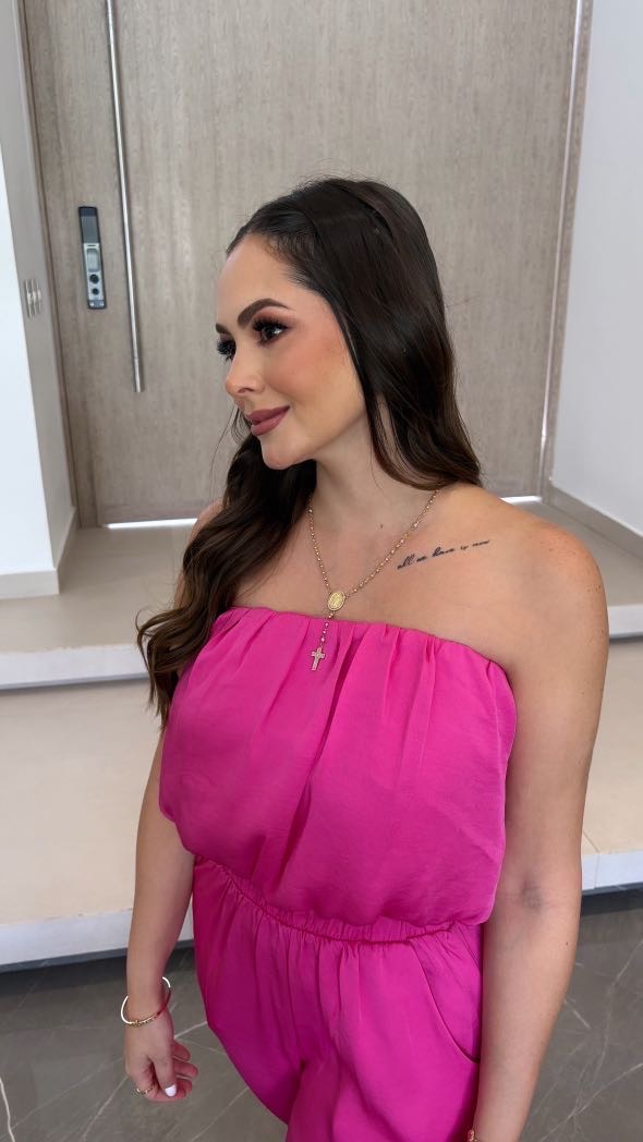 Crop top strapless americano color fucsia en seda. Set completo disponible.