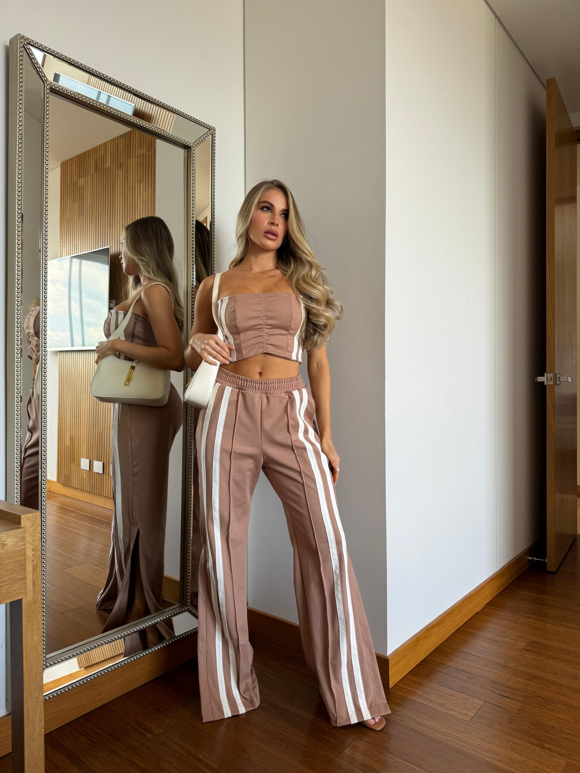 Set de pantalón y top color beige en tela punto de roma. Talla única.