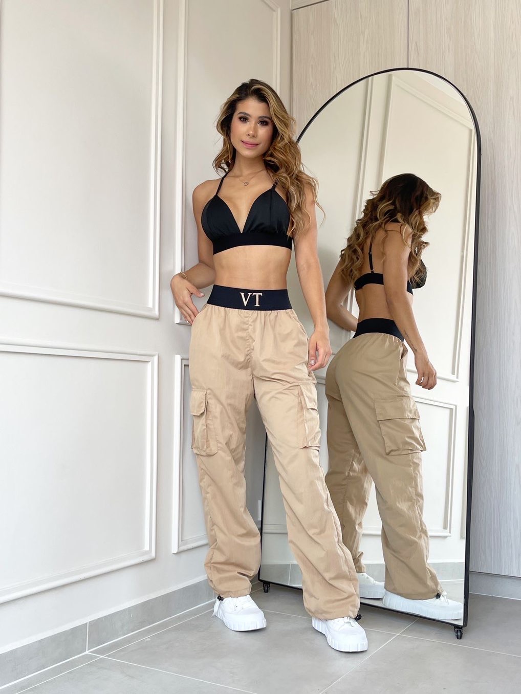 Set de 2 piezas: pantalón tipo cargo beige y top color negro. Talla única.