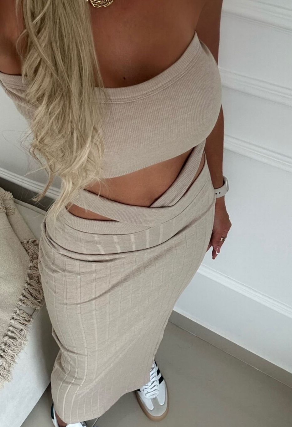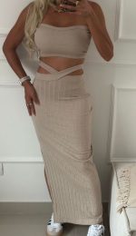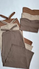 Set de 2 piezas: falda y top en rib algodón grueso disponible color camel y taupe, talla única. No disponible por separado.