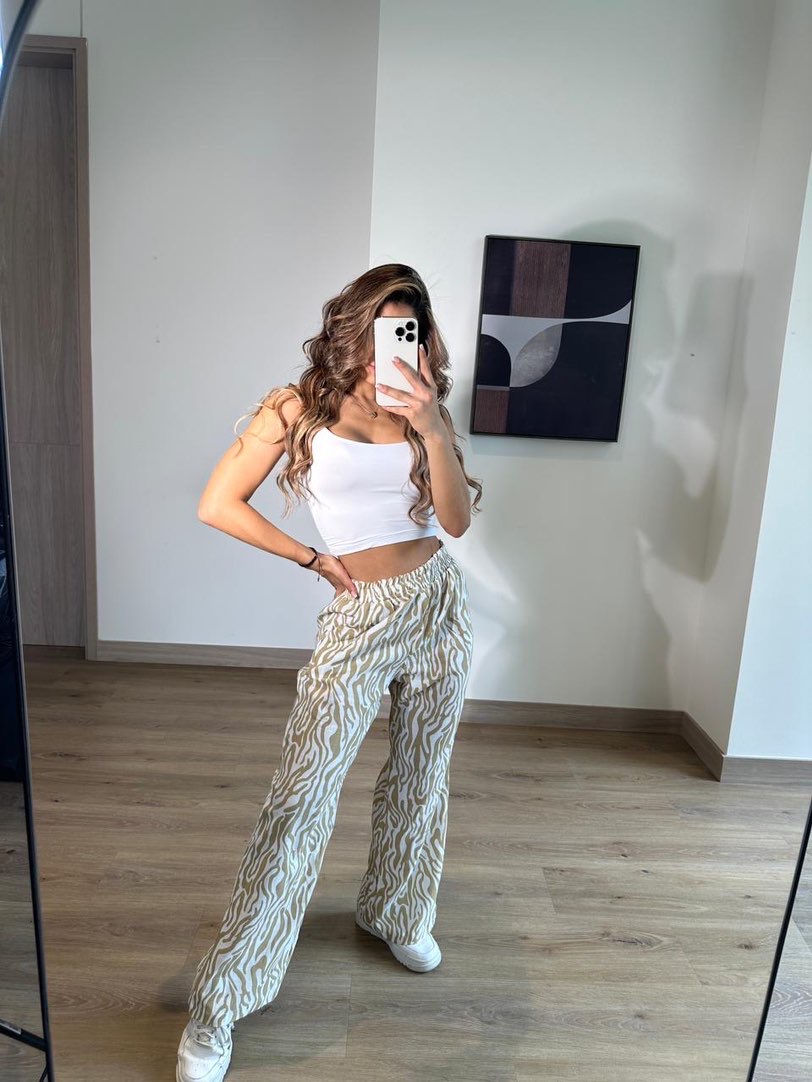 Set de crop top blanco en lycra y pantalón con estampado zebra en color beige con blanco en lino.