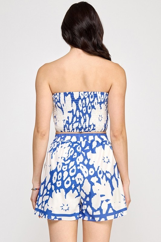 Set de short con bolsillos y blusa strapless tipo pañoleta estampado americano. Color azul/blanco.