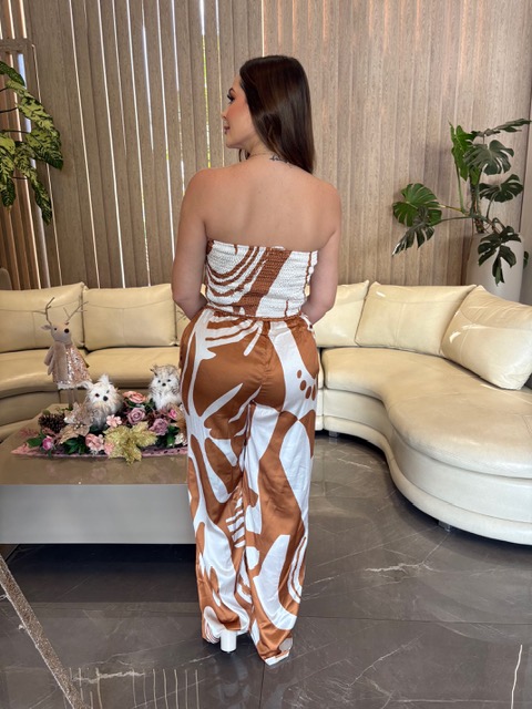 Set americano estampado en seda de 2 piezas: pantalón y crop top straple tipo pañoleta.