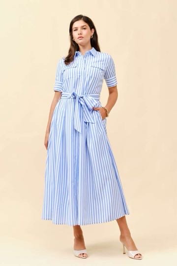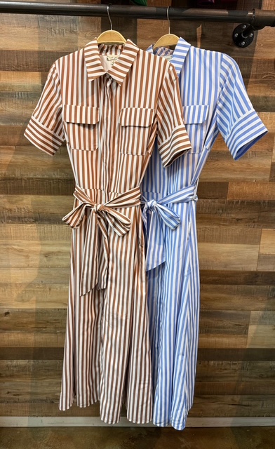 Vestido americano en tonalidad azul con rayas blancas y en tonalidad café con rayas blancas.